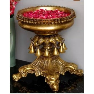 This handcrafted brass urli bowl is artfully designed in the majestic form of a peacock, with elaborately detailed feathers and a proud, sculpted head. The urli sits firmly on peacock-shaped legs and is ideal for floating flowers, potpourri, or tealights, adding a regal and festive touch to entryways, living rooms, or celebration decor. Its traditional yet eye-catching design serves both as a functional vessel for festivities and a stunning centerpiece for any home.