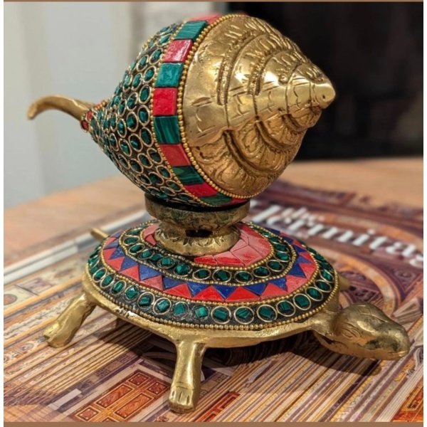 Decorative brass shankh on tortoise base, studded with gemstones and vibrant enamel, ideal for home decor or auspicious gifting.
