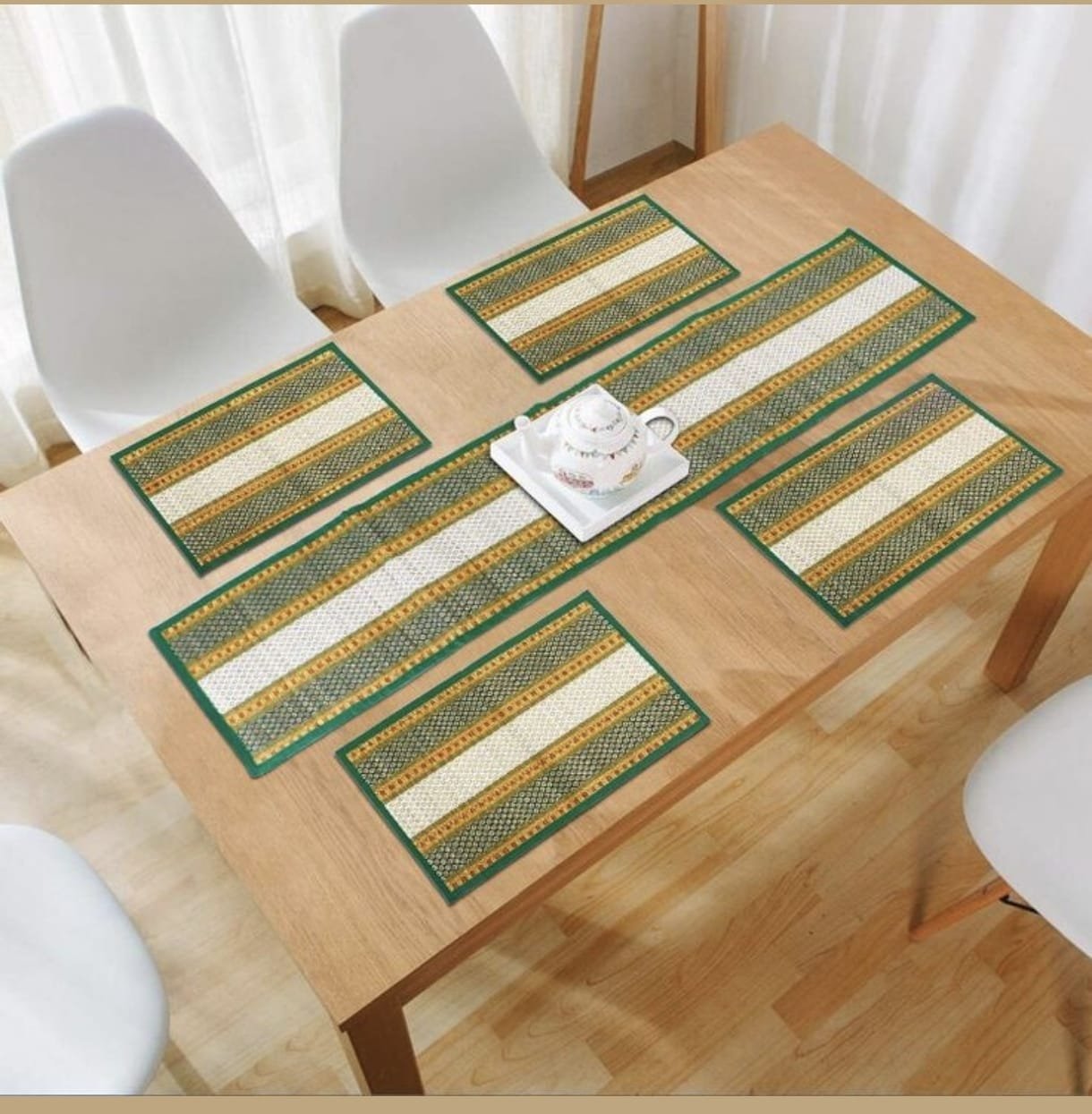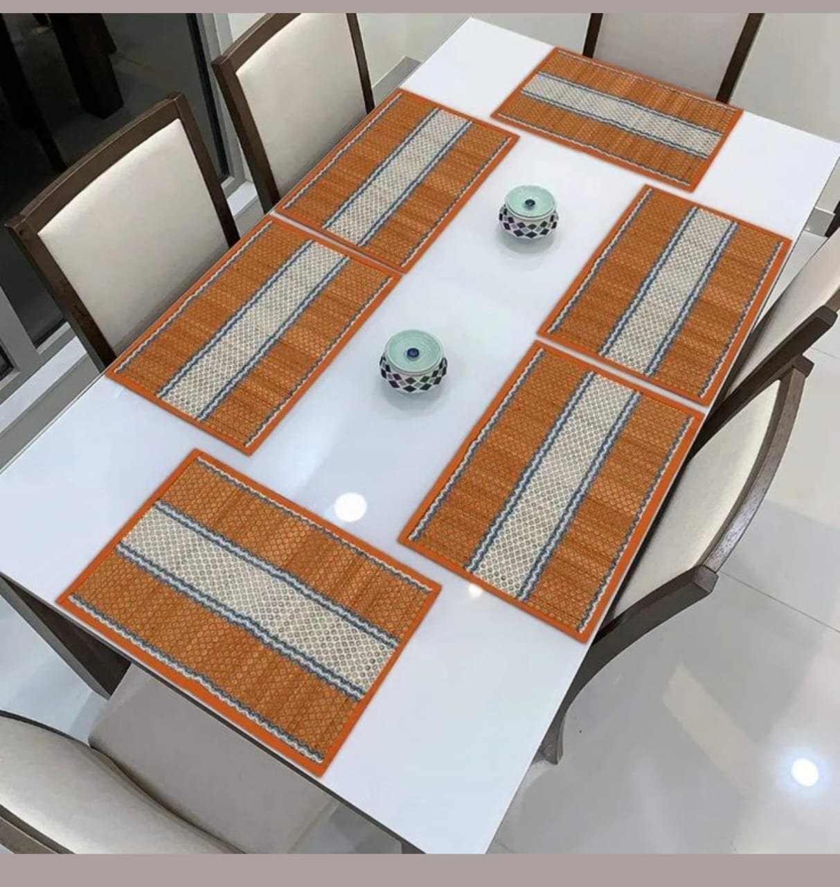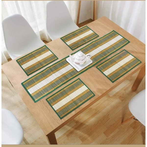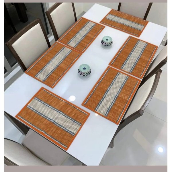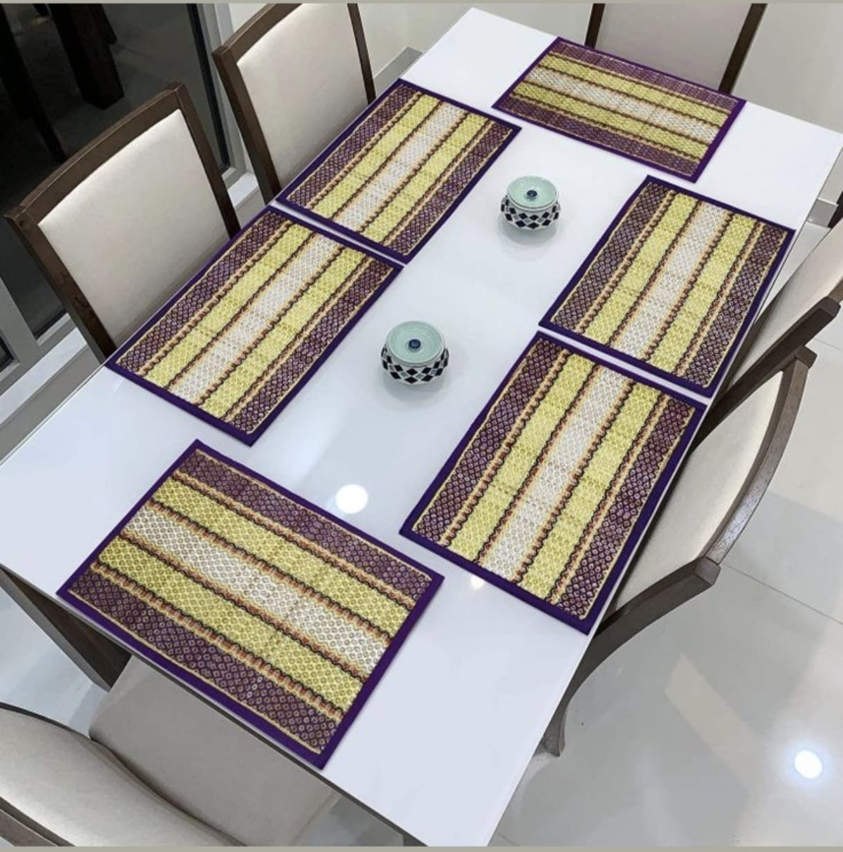 – Add a touch of opulence to any dining table with this set of six striped placemats. Each placemat features a woven fabric base accented with metallic gold threads and rich purple borders, creating a luxurious, coordinated look for formal dinners or festive gatherings.