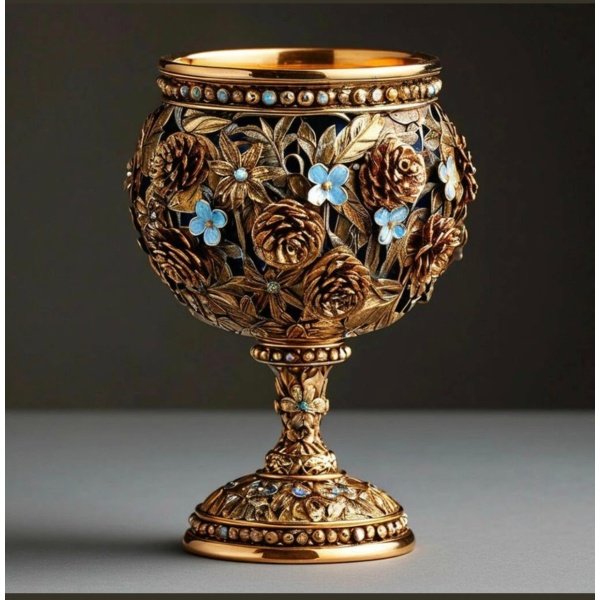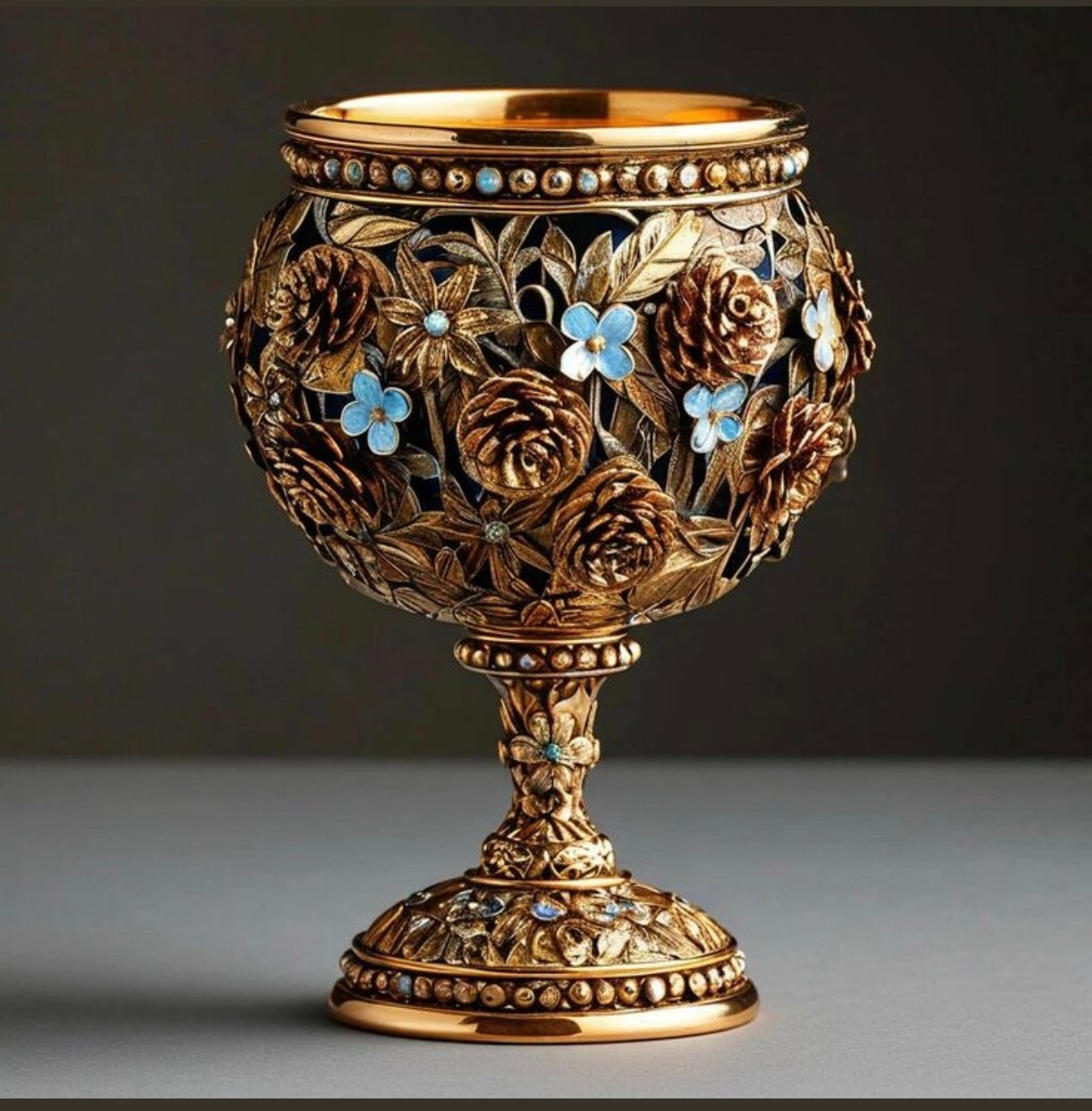 This exquisite goblet is masterfully crafted from brass and features elaborate embossed floral and pinecone patterns adorned with delicate blue enamel accents. The bowl and base of the goblet are intricately decorated with raised flowers and leaves, highlighted by sparkling gemstones that enhance its elegance. Perfect as a centerpiece, collectible, or luxurious gift, this goblet combines traditional craftsmanship with ornate artistry for a distinctive decorative statement.