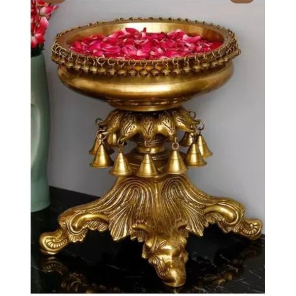 This magnificent urli bowl is crafted from high-quality brass and elevated on an intricately sculpted pedestal base with ornate, claw-like feet. The rim of the bowl is adorned with a ring of tiny bells, while larger decorative bells hang elegantly from the stand, adding both visual and auditory charm. Ideal for displaying floating flowers or potpourri, this piece embodies luxury and traditional Indian artistry, making it a striking centerpiece for festive occasions or upscale home decor.
