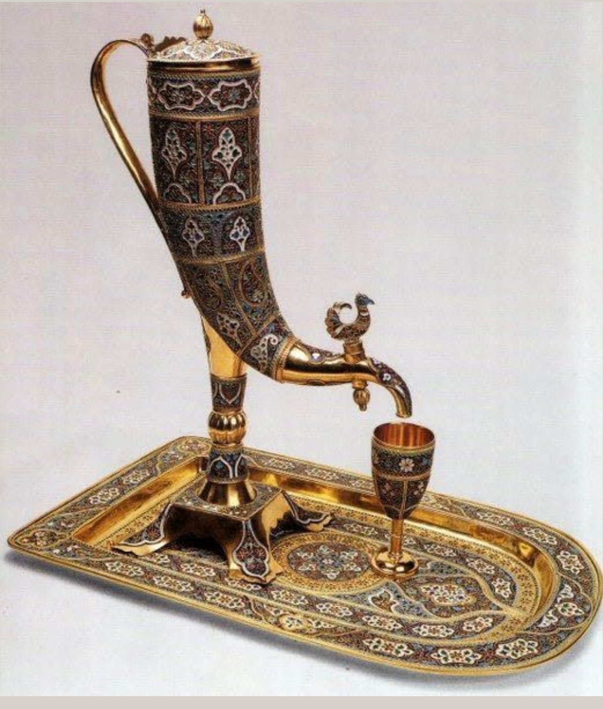 This magnificent ewer set exemplifies traditional Persian craftsmanship, featuring a tall, horn-shaped ewer intricately hand-painted with elaborate enamel floral and geometric motifs in deep blue, gold, and white. The ewer is mounted on a matching tray and is complemented by a finely detailed goblet. The elegant Arabic-styled spout and faucet, rendered in gold, are enhanced with an ornate bird motif. Ideal for display, ceremonial serving, or luxury gifting, this set is a statement of heritage, artistry, and luxury.
