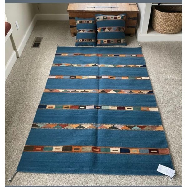 This is a handwoven blue geometric rug and pillow set, ideal for adding a touch of artisan style to modern or bohemian interiors. The set features a rich blue base with multicolored geometric patterns that bring warmth and personality to any space.