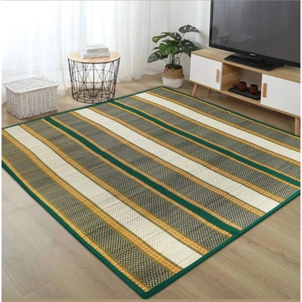 This floor mat features a timeless striped design with earthy green, golden, and cream tones, bringing a touch of traditional elegance to any room. Crafted from high-quality cotton and synthetic fibers, it is lightweight, easy to clean, and perfect for daily use in living rooms, bedrooms, or as a multipurpose mat for yoga or picnics. Its durable weave ensures comfort and long-lasting performance for modern and classic interiors.